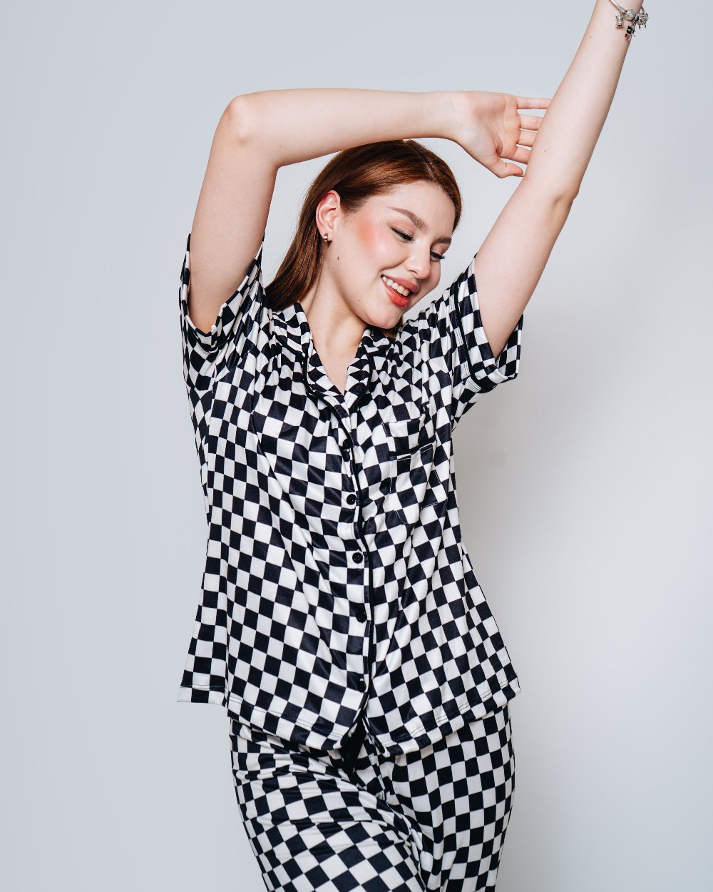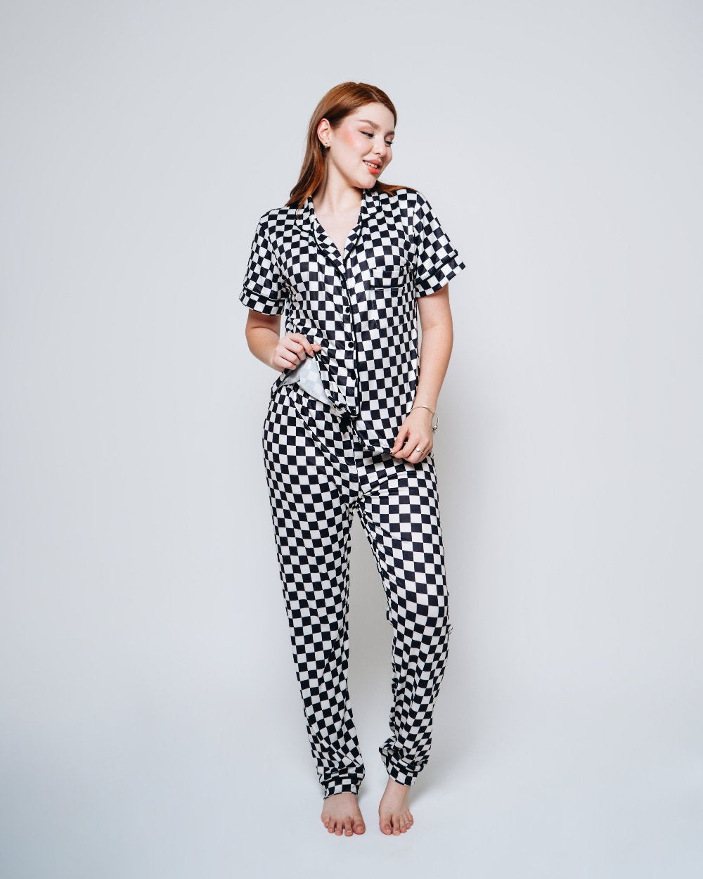 Conjunto de pijama para dama en pantalón con estampado de cuadros blancos con negro.