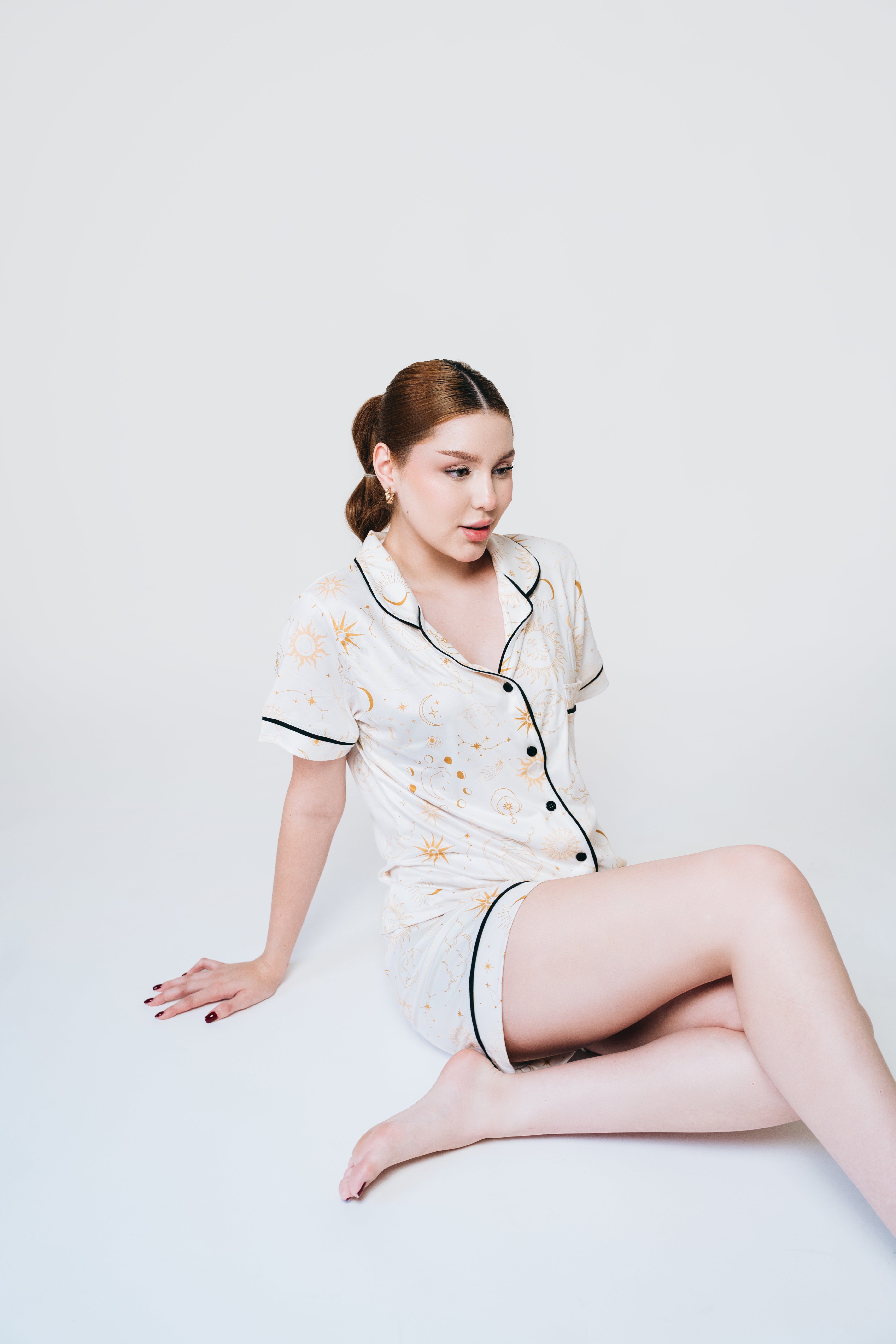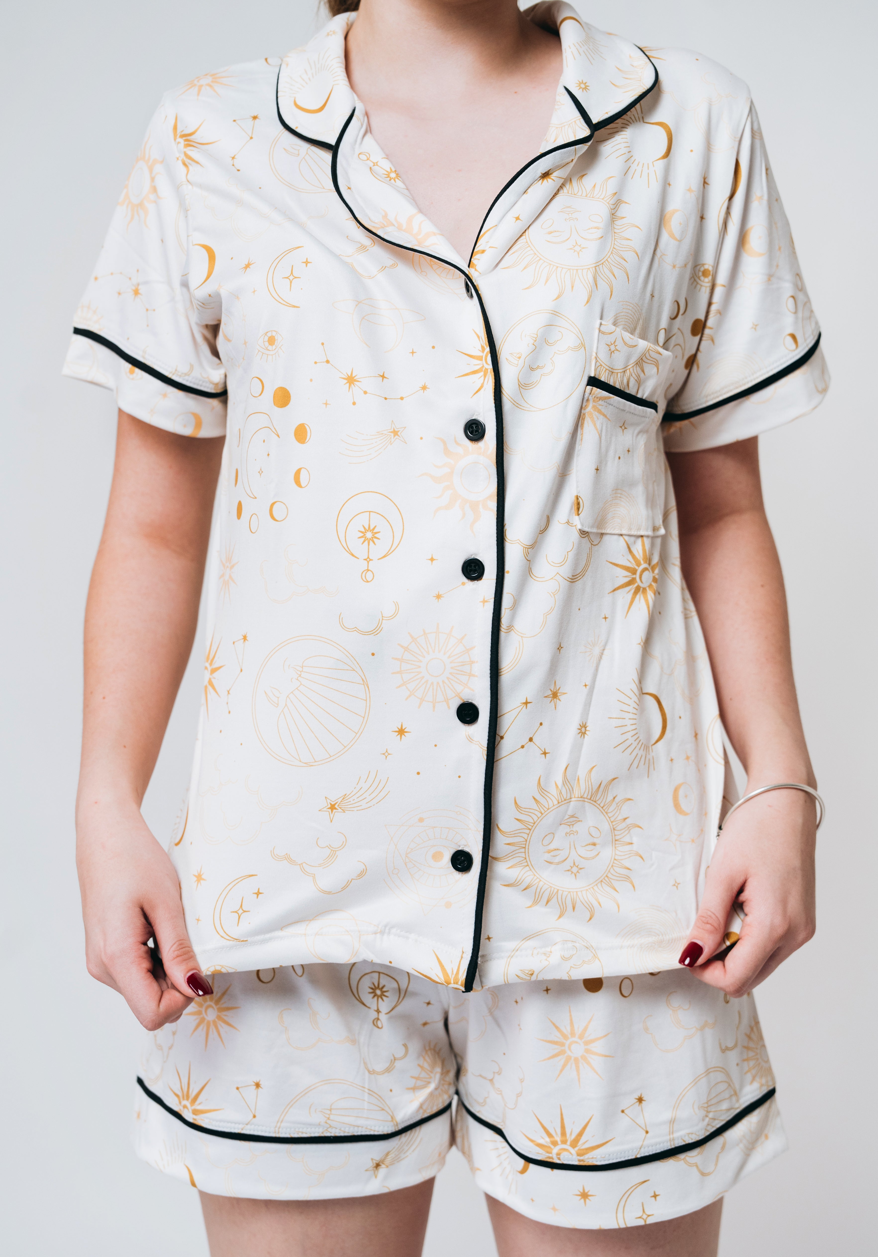 Conjunto de pijama de short con camisa manga corta con botones en estampado de astrologia con detalles de sol y lunas con detalles de color dorado y su fondo beige.