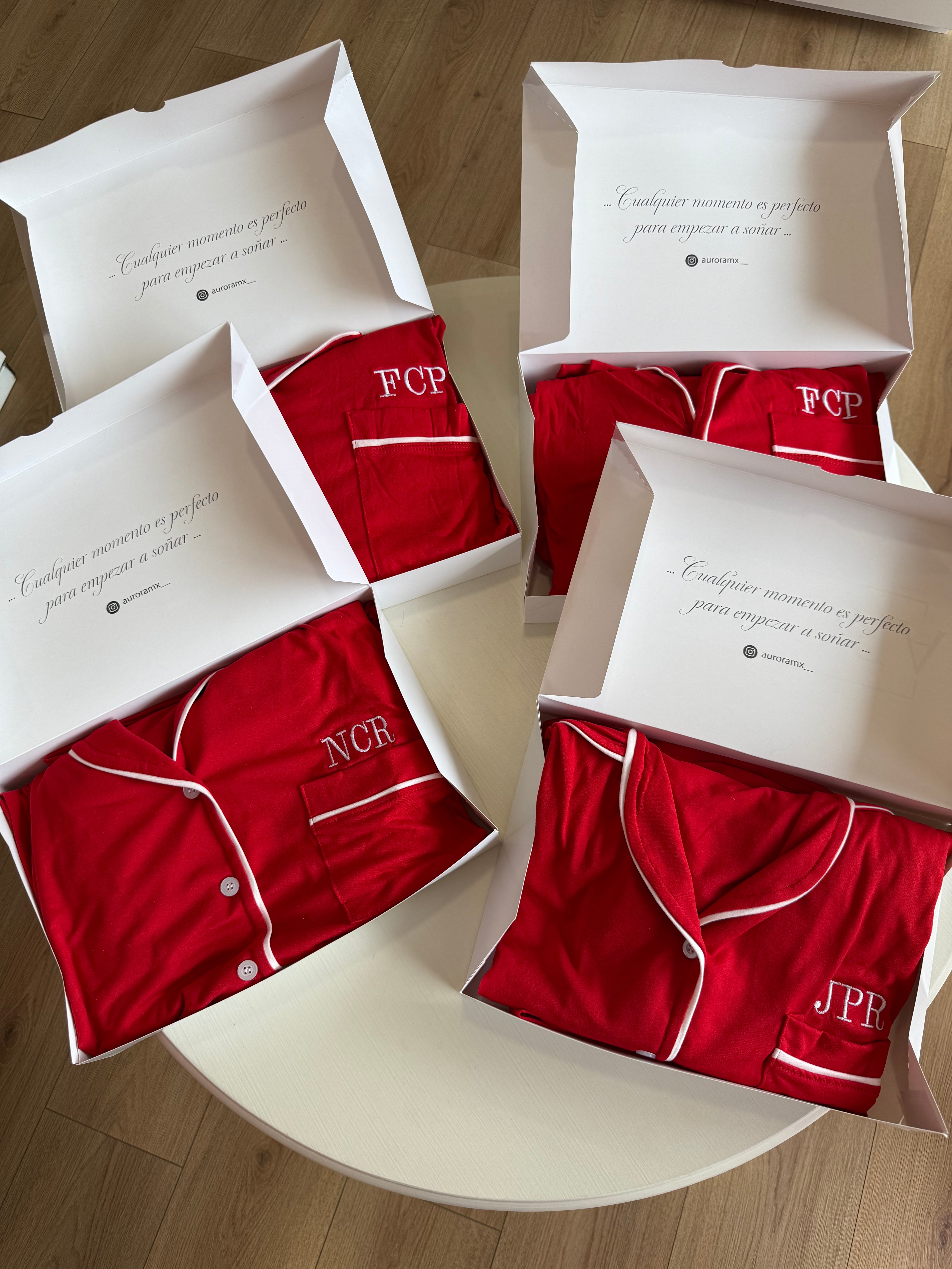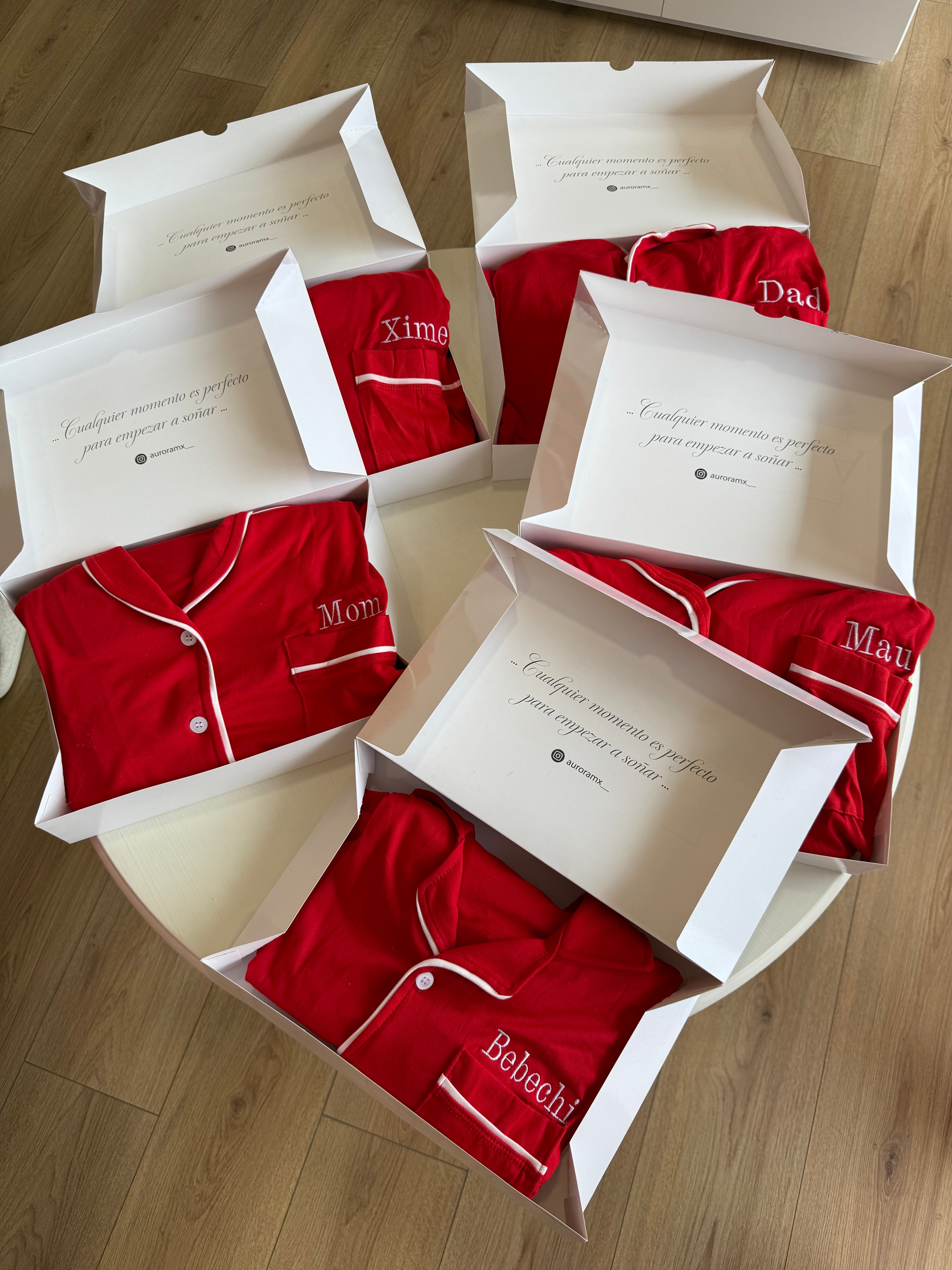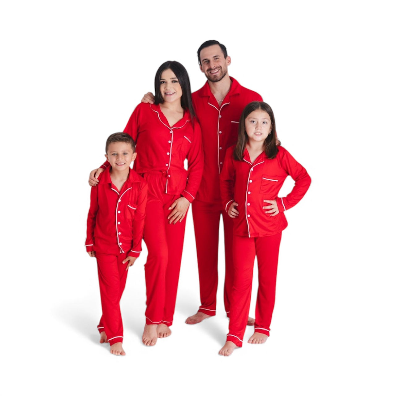 Conjunto de pijama familiar edición navidad en color rojo con bies blanco en suave tela de algodon con camisa de botones y pantalón.