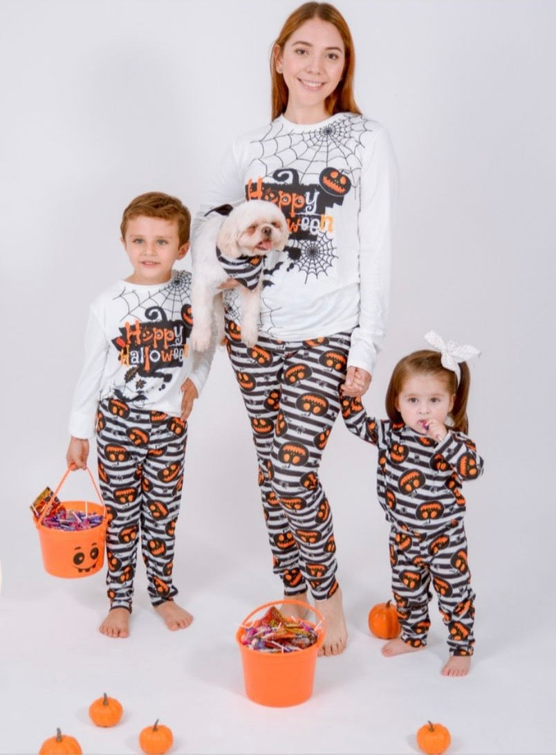 Pijama infantil en camisa manga larga con pantalon suave de algodon en estampado de halloween en color blanco con calabazas y rayas negras con blanco en pantalon.