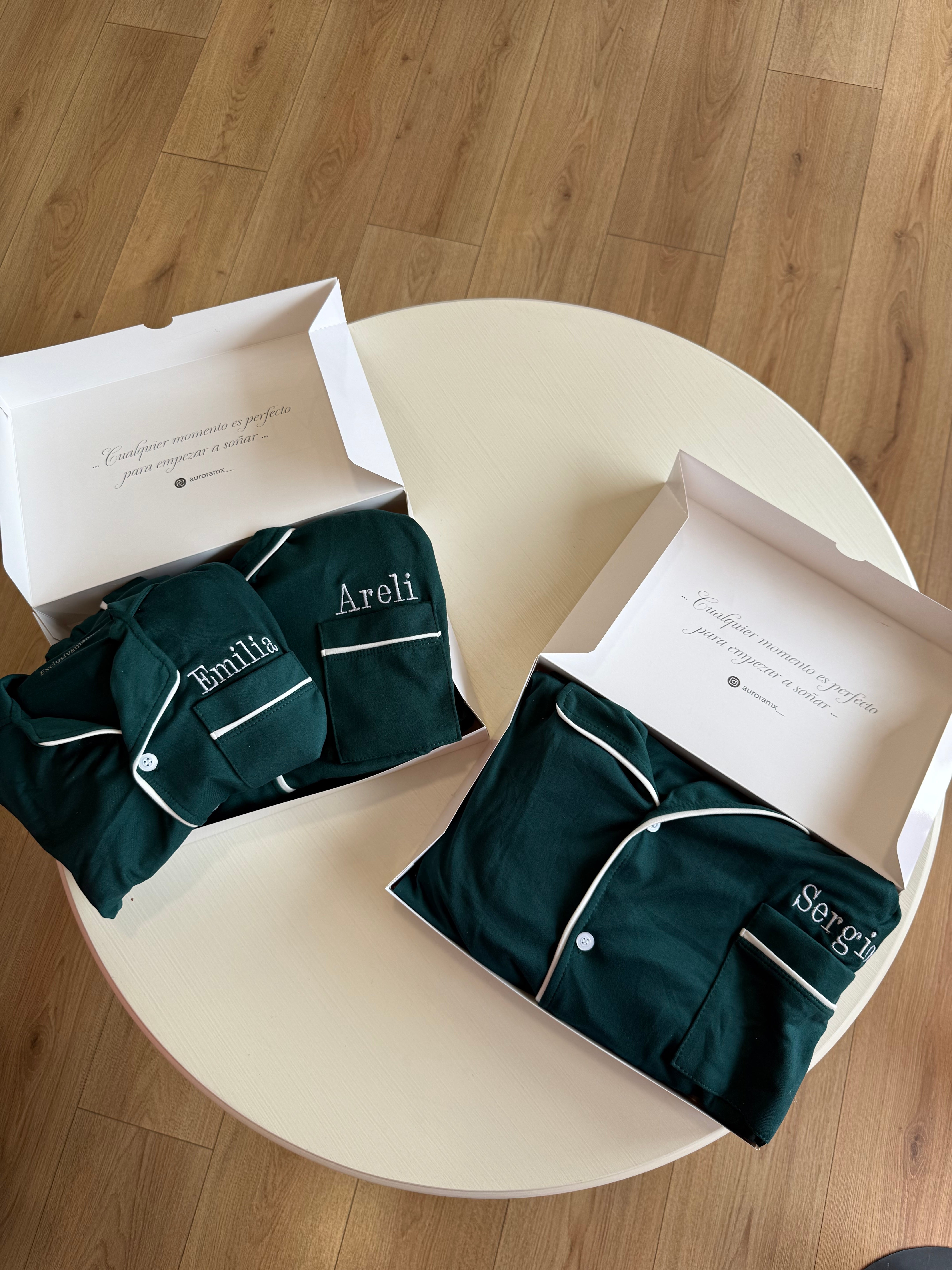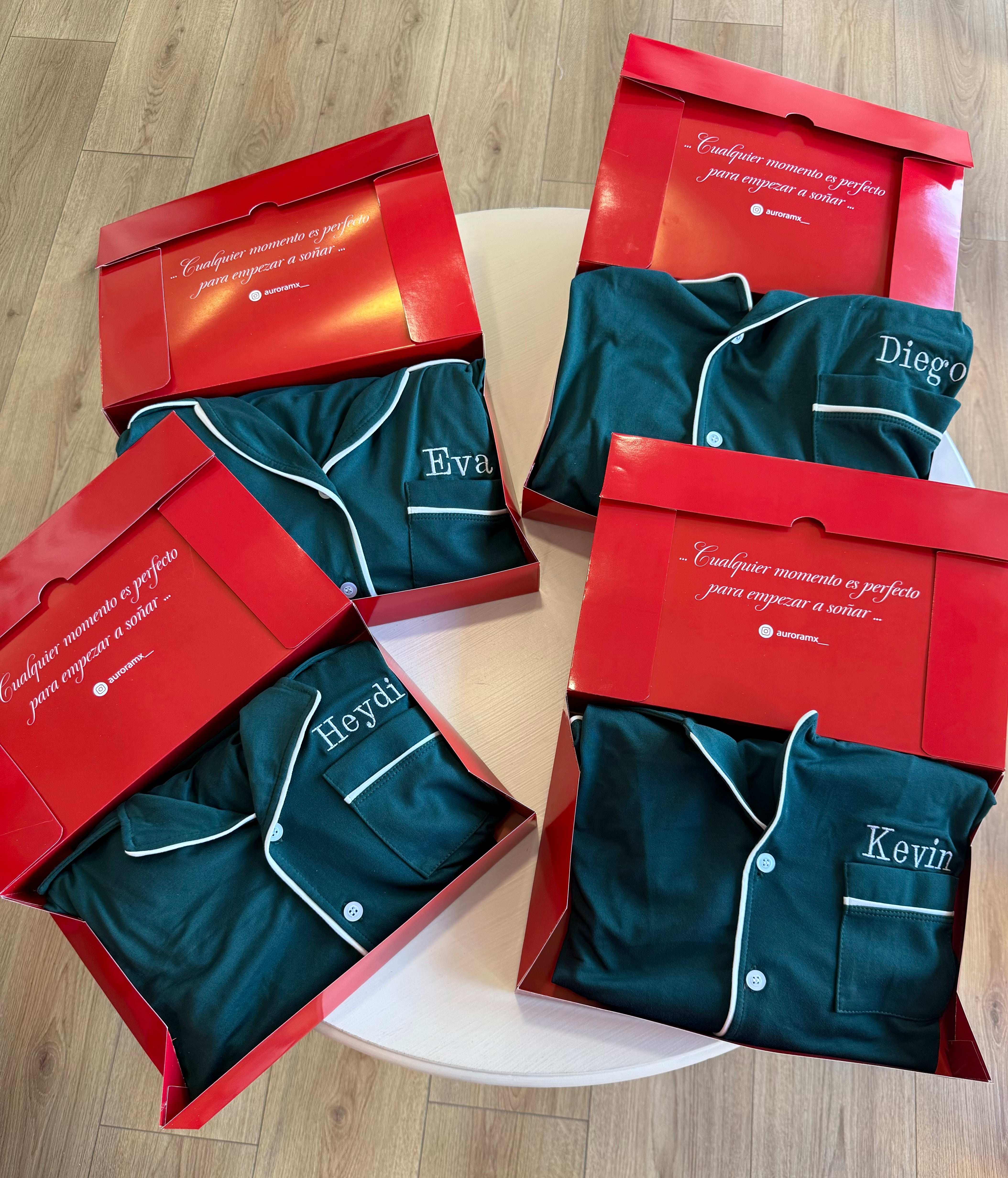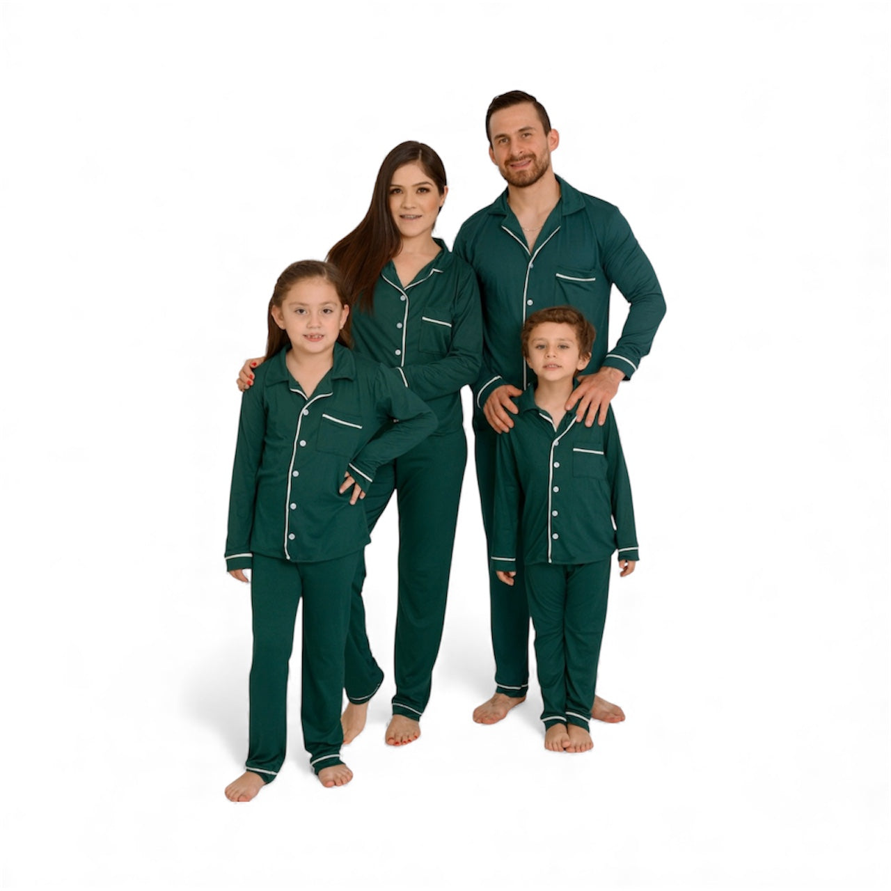 Conjunto de pijama familiar edición navidad en color verde con bies blanco en suave tela de algodon con camisa de botones y pantalón.