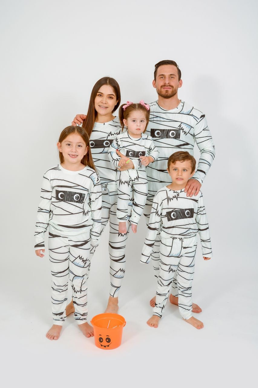Pijama familiar en camisa manga larga con pantalon suave de algodon en estampado de momia en color blanco con ojos en el medio.