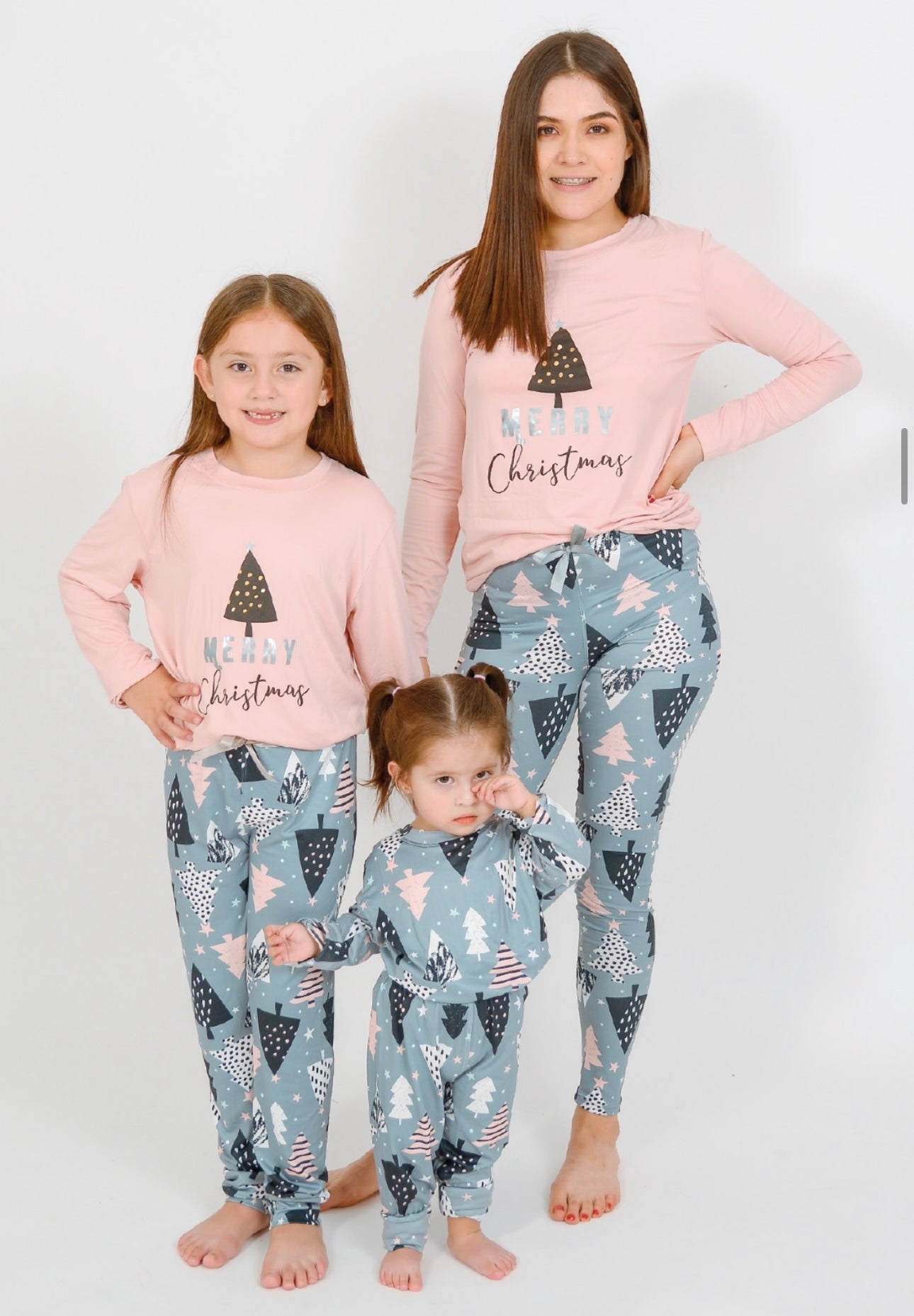 Pijama para mama e hija o individual con estampado de pino de navidad en tonos grises, blanco y negro con playera de manga larga en tono rosa con estampado de navidad en suave tela de algodon.