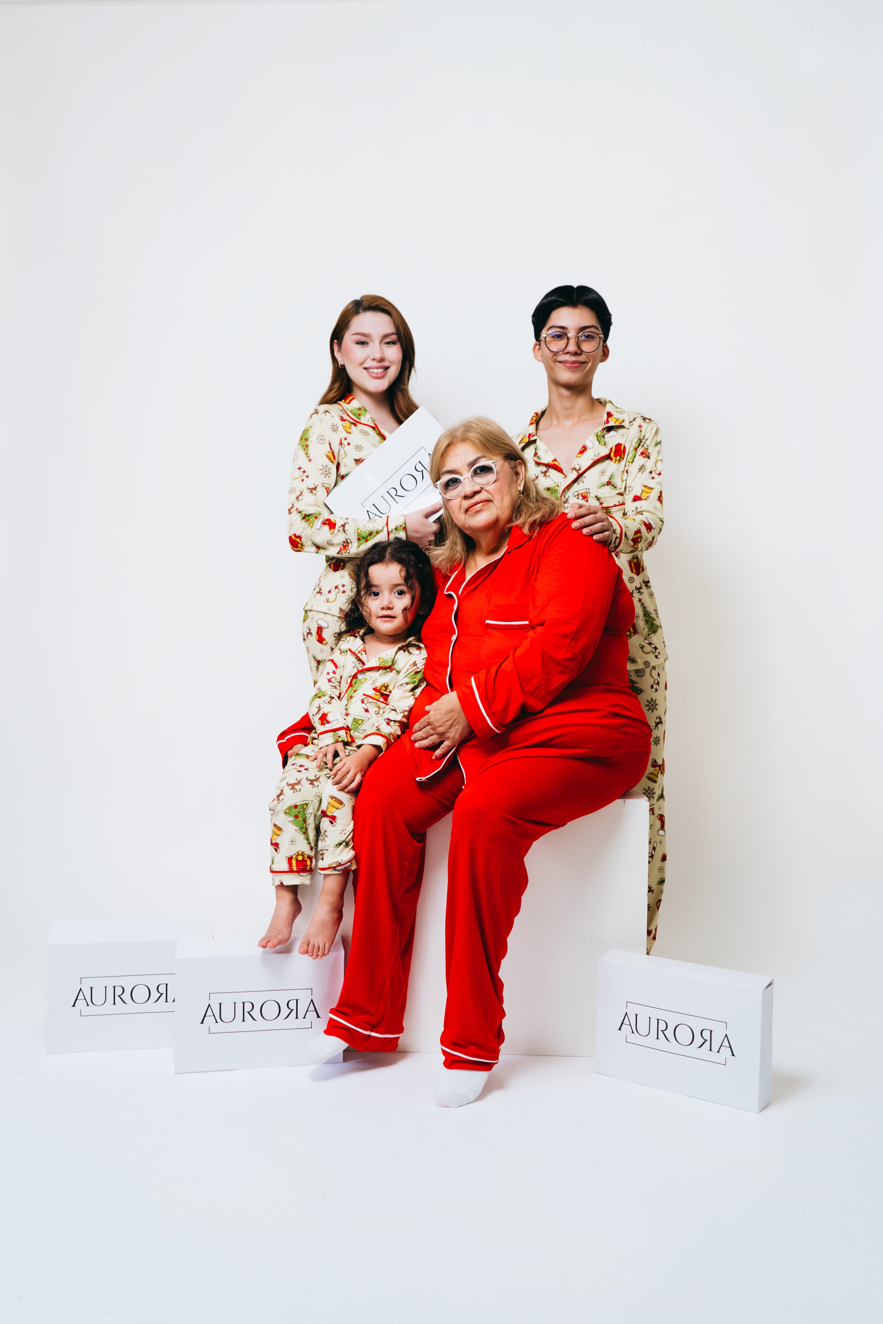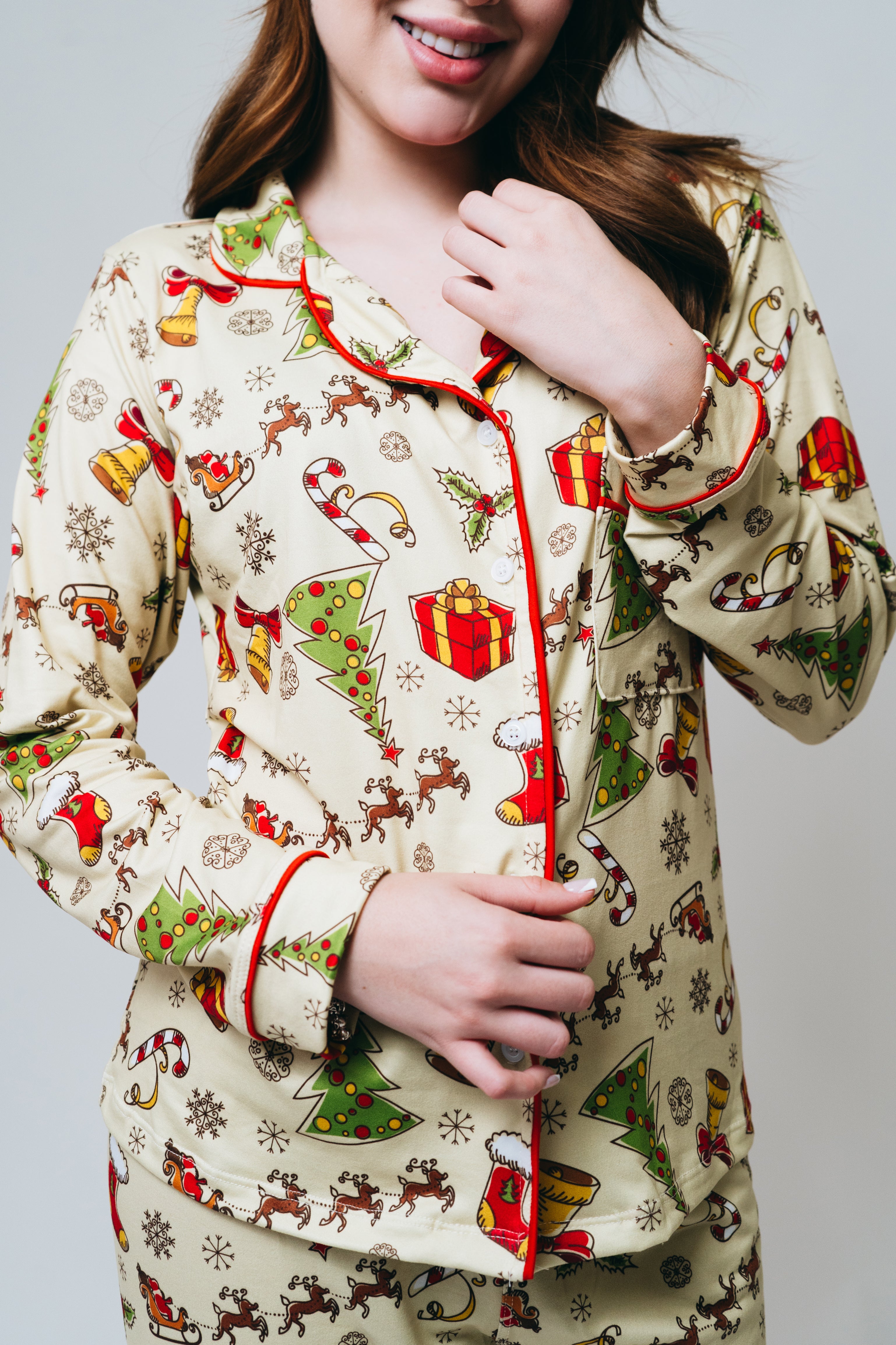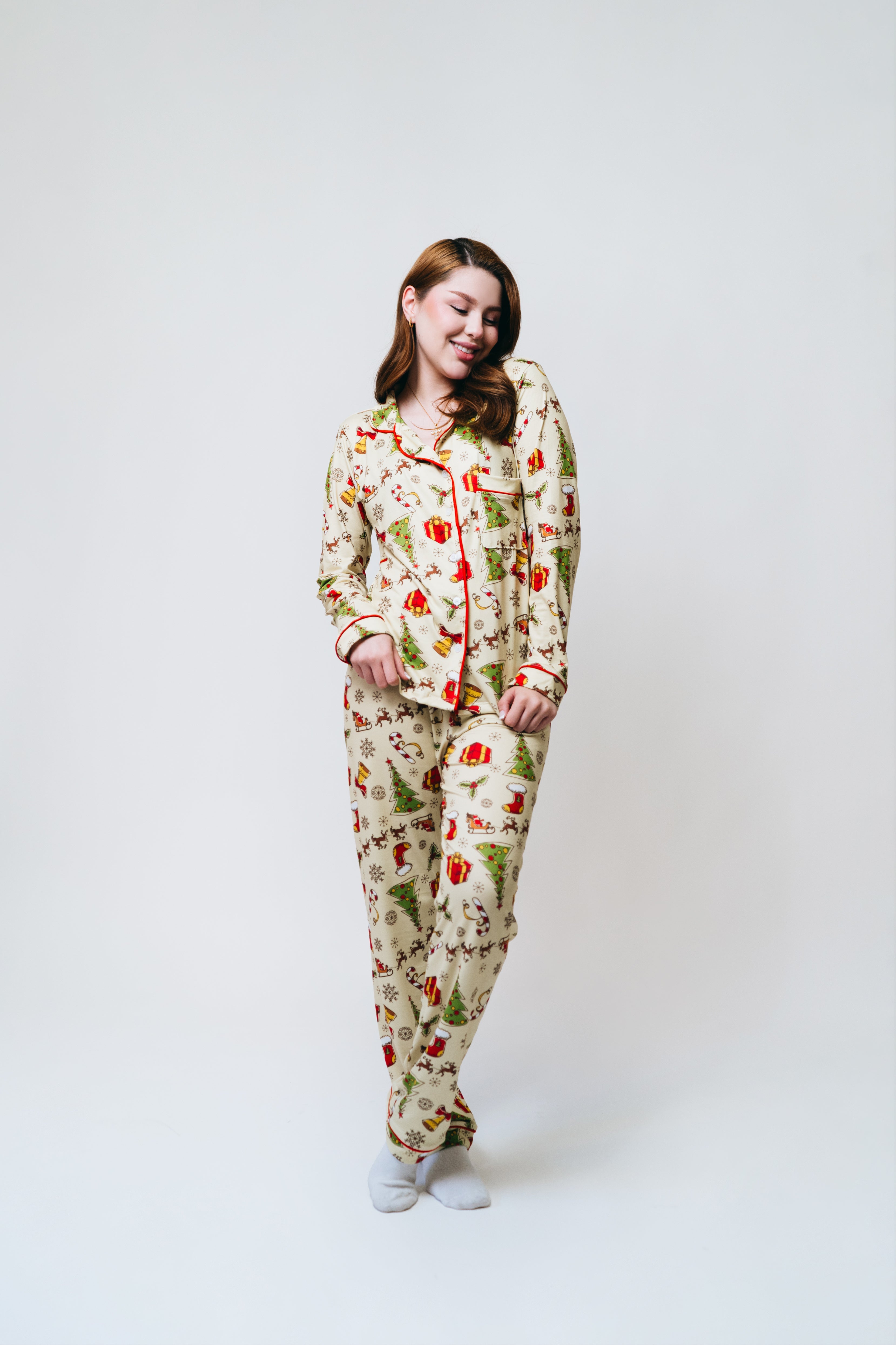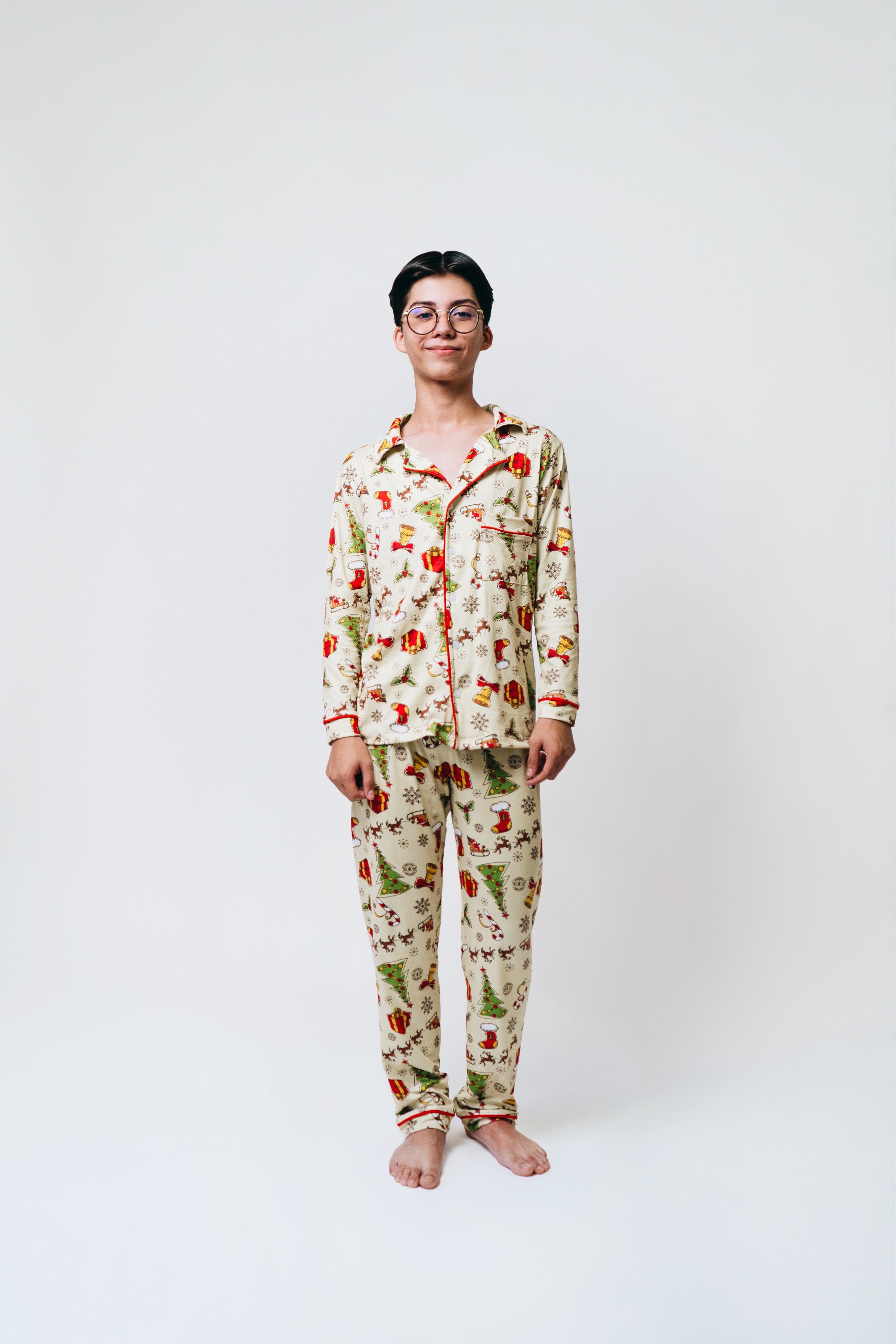 Conjunto de pijama edición navidadc con estampado de regalos y trineo de santa clos en tono verde con líneas rojas en camisa de botones con manga larga.