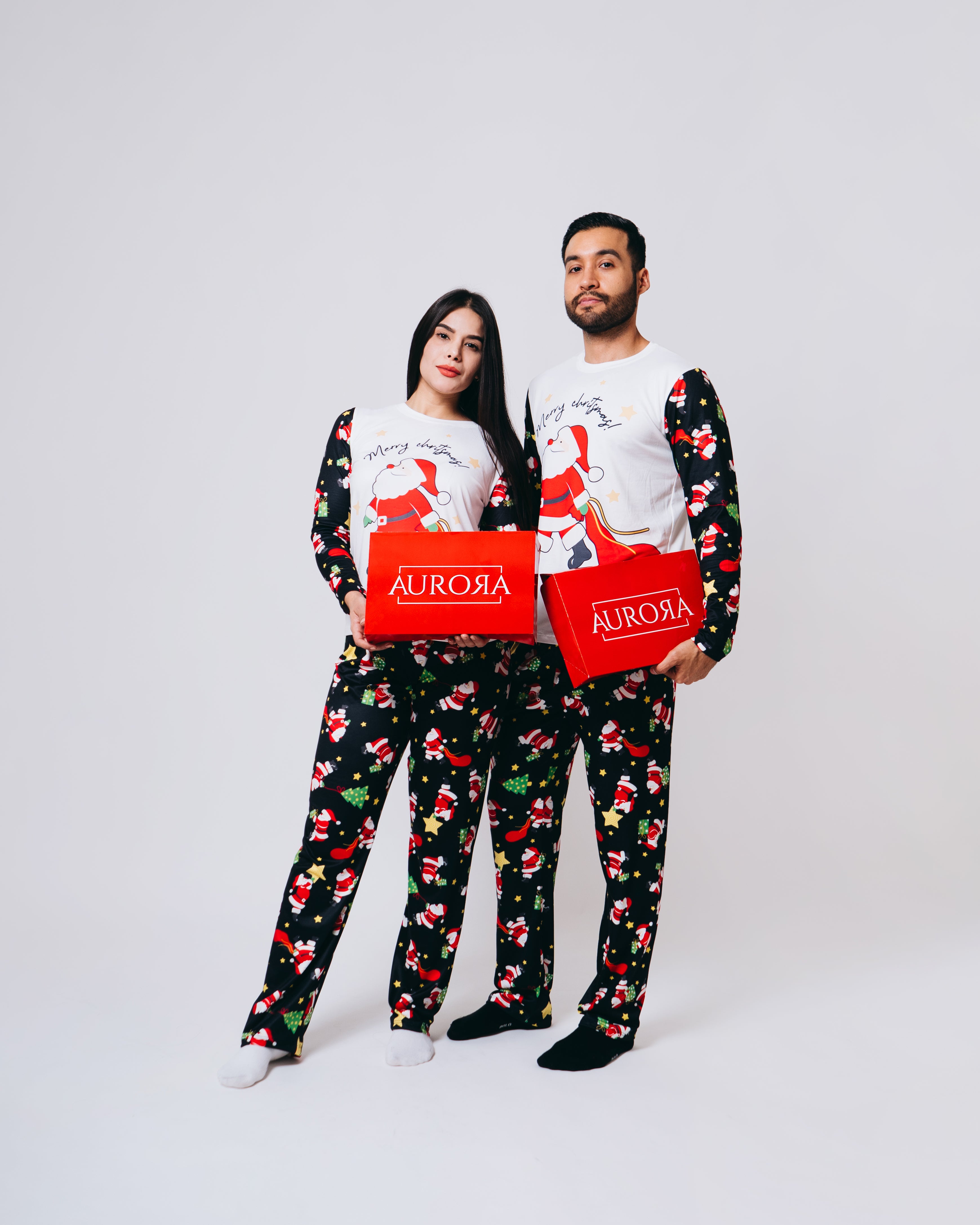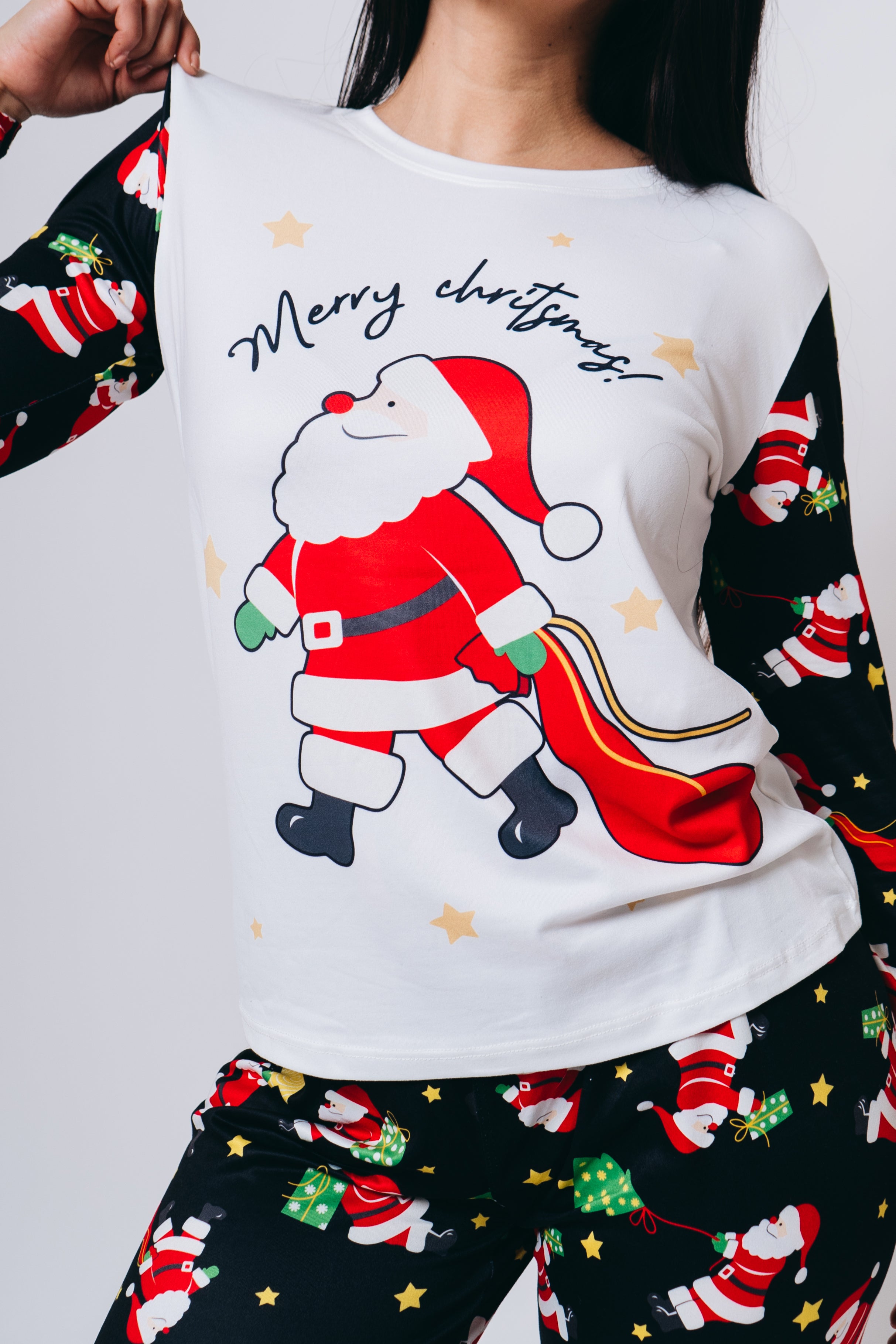 Pijama familiar temática santaclos en playera blanca con estampado y mangas de color negro con diseño de estrellas y santaclos con mismo print en pantalón de color negro.